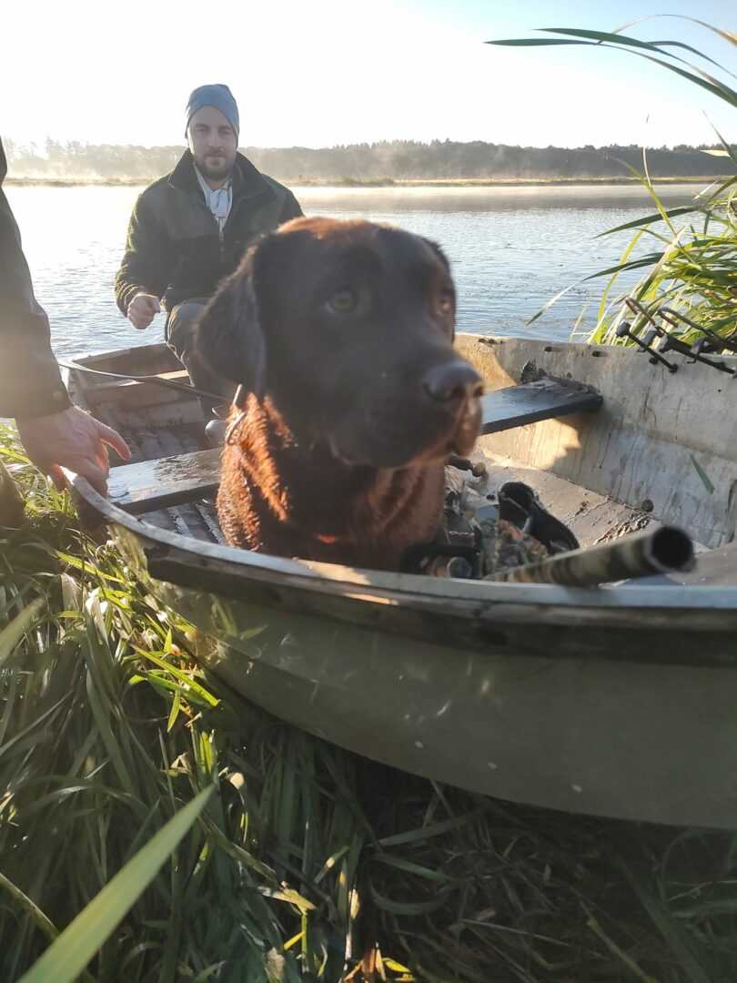 Kl. 4:00 stod vi, fire forventningsfulde jægere og en endnu mere ivrig labrador, ved den førnævnte jolle. Så med tændte pandelamper blev, jægere, jagthund og lokkefugle, læsset i båden og turen gik de små 150 meter ud en lille ø, som ligger placeret ude midt i søen.