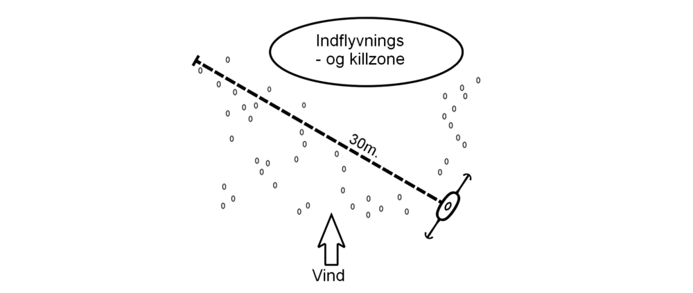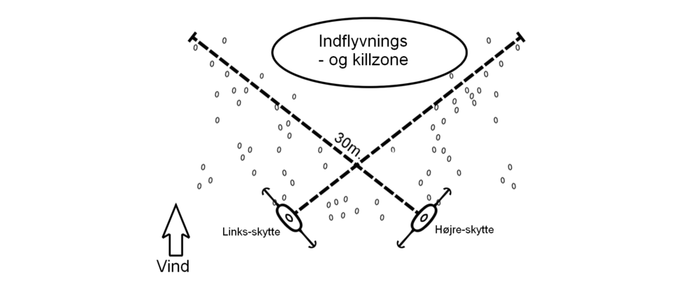 Er du højreskytte skal hovedparten af lokkefuglene og åbningen i formationen gerne være til venstre for dig. Er der sidevind vil fuglene komme parallelt med kysten mod vinden og du kan vende formationen fra før, så den nu er vinkelret på land og med den store åbning mod den retning fuglene kommer fra. Dette skulle gerne få fuglene til at komme ind til landing, hvor du får gode og forsvarlige skud til dem. Skyd fuglene inden de sætter sig, hvis de vil helt ned. Jeg skyder aldrig fuglene på vandet. En af grundene til dette er, at de udgør et lille mål, og at der er risiko for at gennemhulle lokkefuglene. Hvis fuglen/fuglene når at sætte sig, får jeg den på vingerne igen og skyder den på opfløj. At skyde fuglen i flugten, giver for mig en langt større tilfredsstillelse.