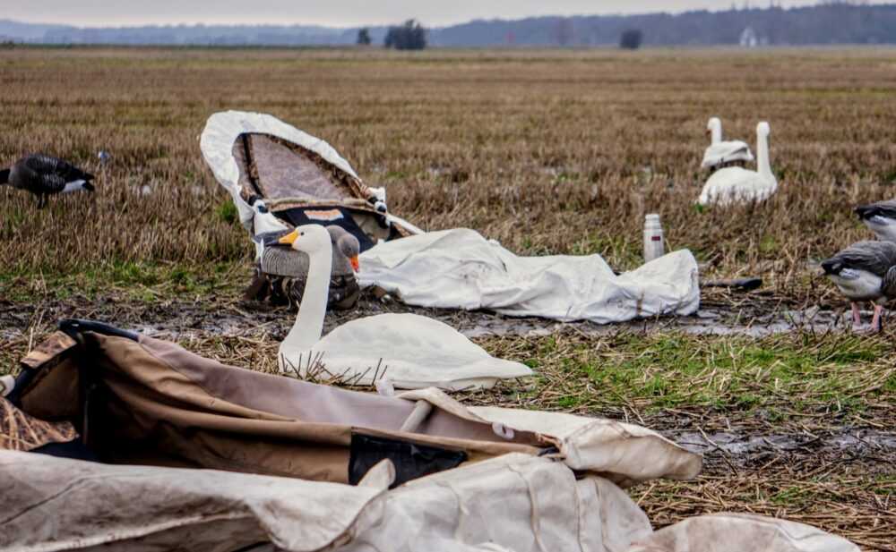 Jeg foretrækker som regel at jage med så mange lokkere som muligt, men der kan være situationer, hvor der slet ikke skal bruges et større antal. Mere herom senere. Fra først i november og frem til sæsonens afslutning bruger jeg mellem 5 og 15 svaner i mit setup. Lokkefuglene kan stilles op med hovederne i alle retninger. Den gamle regel med at alle fugle skal stå med hovedet op mod vinden, er en dårlig ide, da den signalerer fugle, der er på vagt og klar til at gå på vingerne. Blæser det virkelig meget, vil man dog sjældent se en gås, der står med bagenden direkte op mod vinden. Først på sæsonen og igen hen mod sæsonafslutningen, når fuglene er blevet jagtet meget, har set mange setups af skjul og store lokkefugleflokke og er blevet virkelig sky, kan man med succes benytte sig af “less is more” princippet. Minimér dit setup til en 3-4 tasker med gode lokkefugle og sørg for at gøre noget ud af opstilling og camouflage.