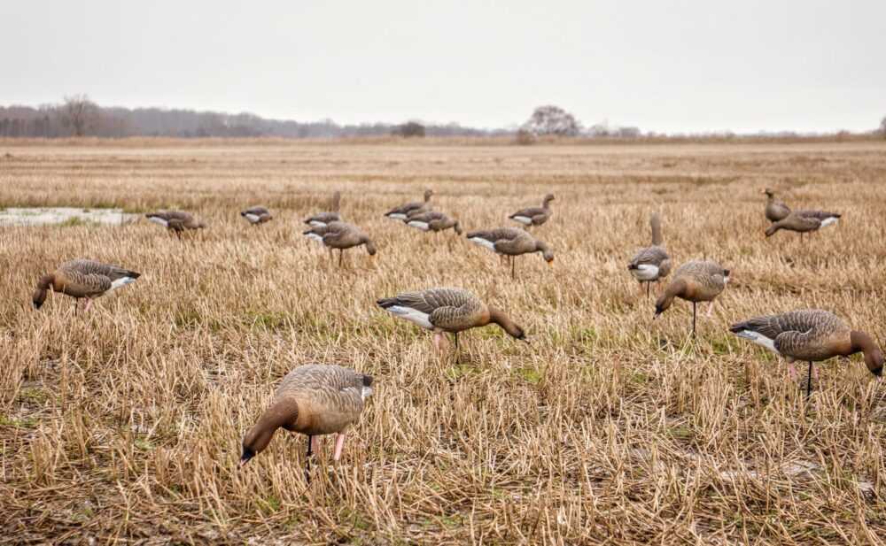 Den lille flok grågæs vender rundt og går op mod vinden for 3. gang. Vores liggeskjul er gemt væk i de høje hvedestubbe og foran og imellem os står en større flok af blandede skaller og full body lokkegæs. De bevæger sig let i vinden og ligner en flok foruragerende og rastende fugle på en stubmark. Gæssene snakker, og jeg lytter nøje til deres lyde og taler med få afvigelser konsekvent samme sprog i mit gåsekald. Jeg studerer deres reaktion og tilpasser min kalden derefter. De store fugle skruer sig ned i højde og har nu samtidig kurs ret mod den zone i lokkefugle formationen, hvor vi tidligt i morges har lavet en stor indflyvnings- og landingsplads. Det nøje udvalgte område i vores setup, som vi ønsker, fuglene skal styre mod og lægge an til landing over, og som vil give os 4, spændte jægere den mest optimale mulighed for at levere dødskudte gæs på et kort og forsvarligt skudhold. Nu er gæssene så tæt på, at vi tydeligt kan se, hvordan de drejer hovederne fra side til side for at finde ud af, om det er sikkert at gå ned.