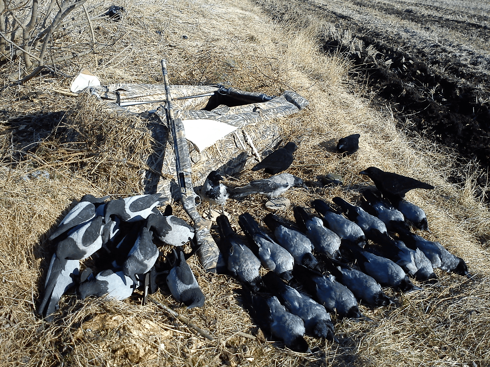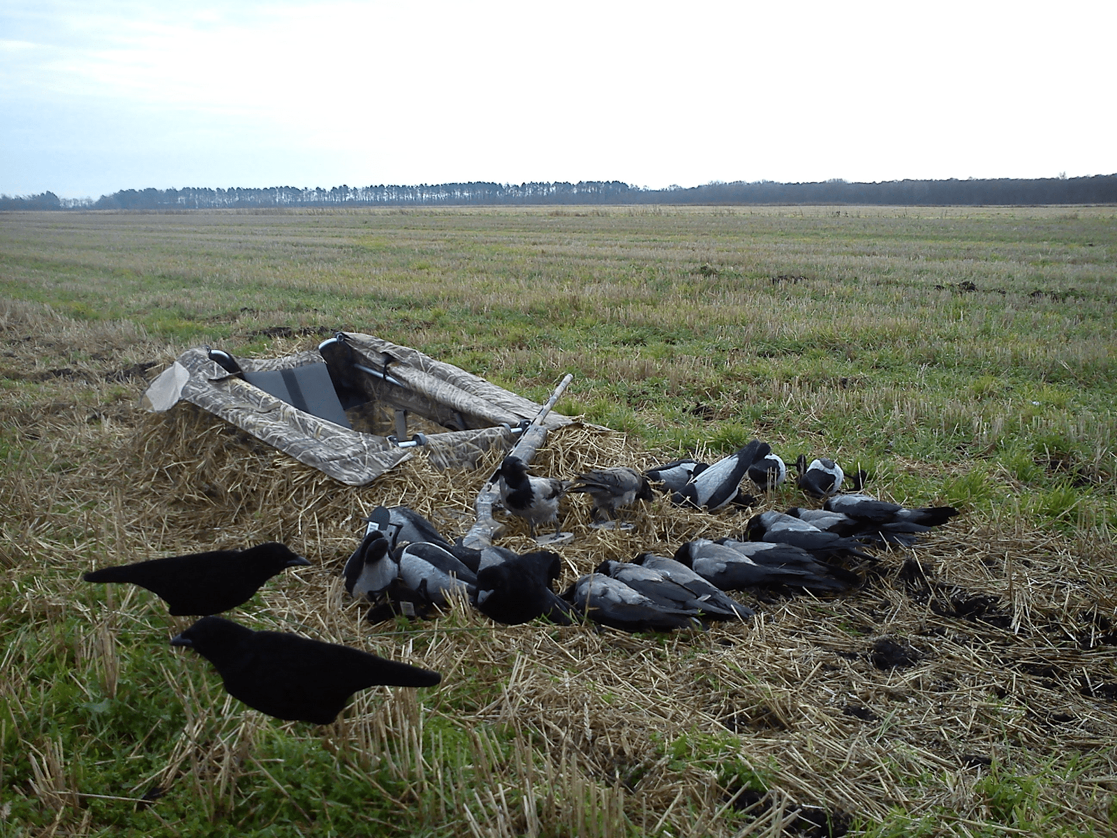 Jeg havde også tre enlige krager, der uafhængigt af hinanden kom efter kaldet og var ved at sætte sig mellem lokkerne. Det gav nogle nemme skud, da de slog vingerne ud for at bremse op, inden de satte sig. Her var de så koncentrerede om lokkere og landing, at de ikke opdagede, at jeg rejste mig fra liggende til siddende stilling. Det er en god følelse, når de dør, inden de opdager en!