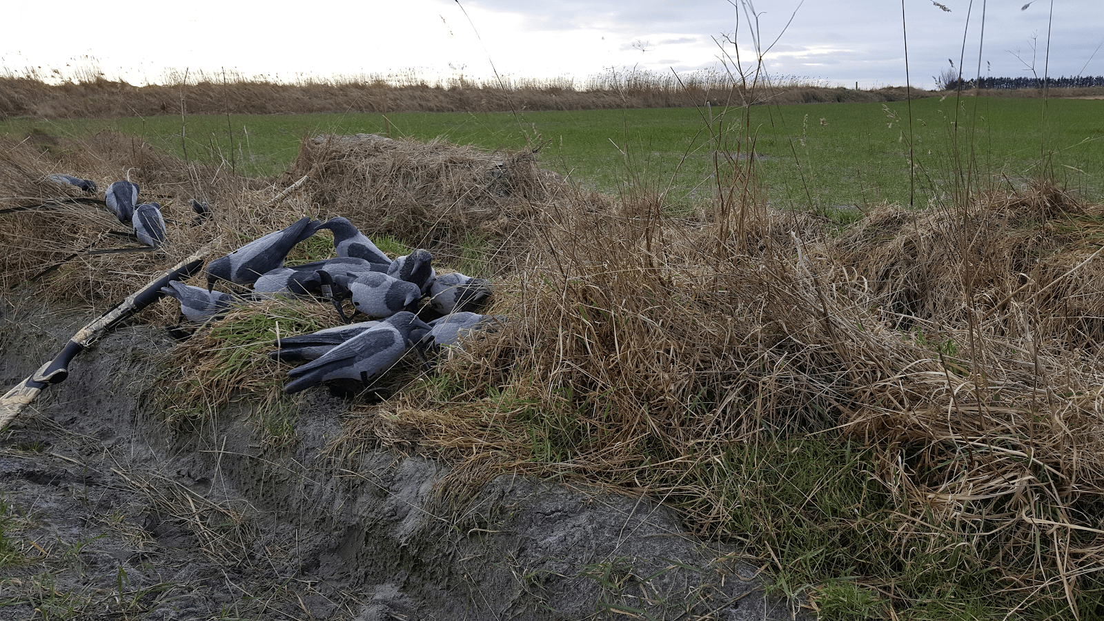 Jeg var på plads i mit layout blind, der var blendet fuldstændig ind i grøftekanten med de på stedet forekommende materialer, en time før solopgang. FT Cockeren lå på min højre side med hovedet på mit lår. Hun var så klar til at apportere. De mange flockede lokkekrager stod i små-grupperinger eller alene på stubmarken til højre for mig. Næsten ligesom de levende eksemplarer, der sad her i går. Jeg spejdede ud gennem layout blindets mesh-net for at være forberedt til at tage imod de første krager.