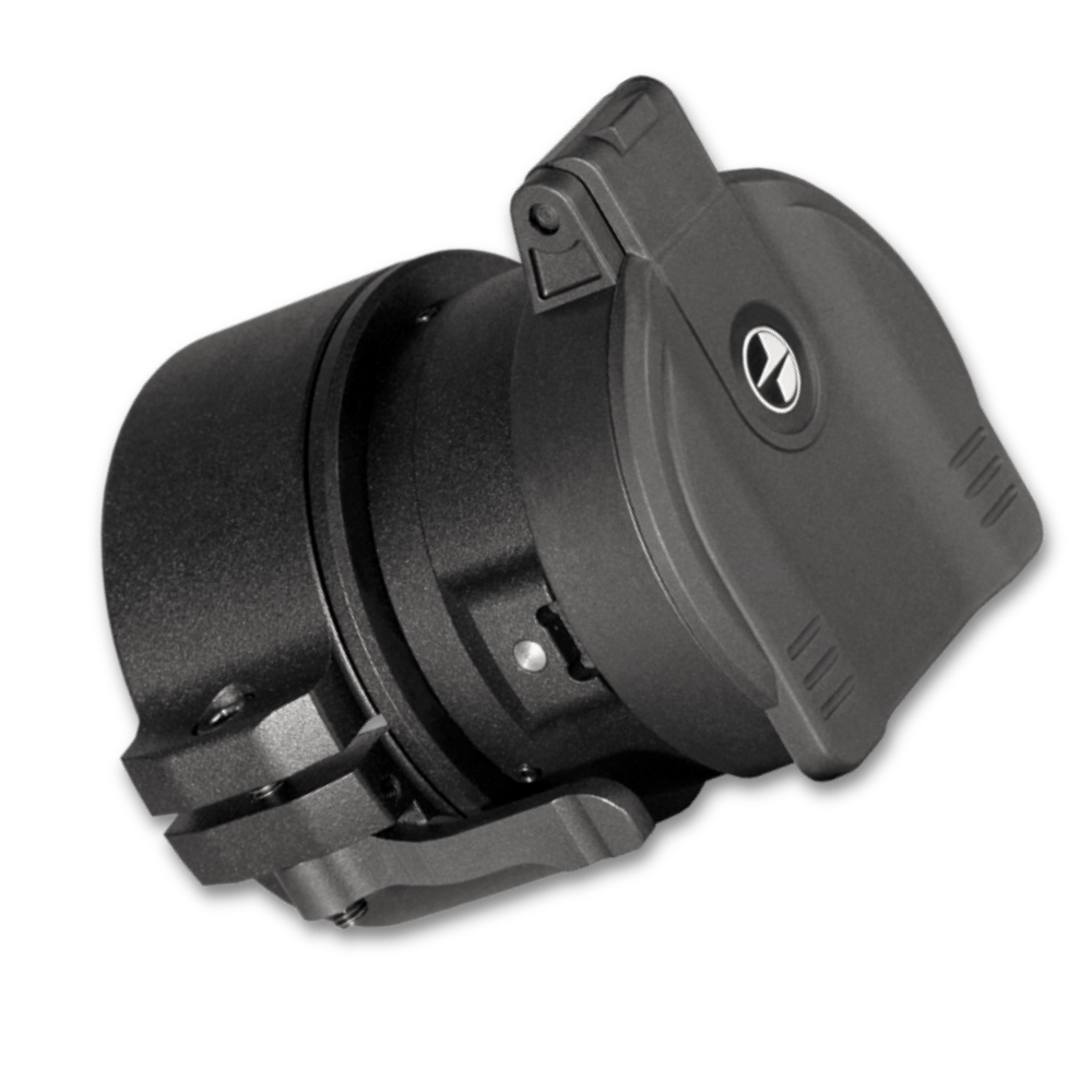 Efter montage sidder adapteren fast på den optisk enhed og gør det muligt hurtigt at installere den digitale nattekikkert foran objektivet på dagkikkerten.