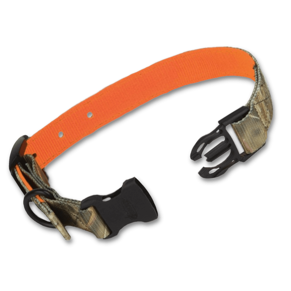 Kvalitets hundehalsbånd fra amerikanske Avery Sporting Dog med KW-1 camo mønster på den ene side og stærk orange på den anden.