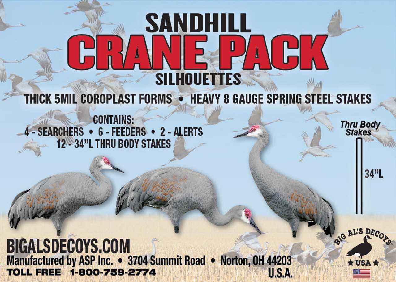 Hver pakke indeholder en velafbalanceret kombination af 2 vagtposter, 6 fødesøgende lokkefugle og 4 søgende lokkefugle, hvilket sikrer en forskelligartet spredning, der tiltrækker tranernes opmærksomhed i forskellige situationer. Lokkefuglene måler hele 86 cm i længden, hvilket giver en imponerende silhuet i marken.