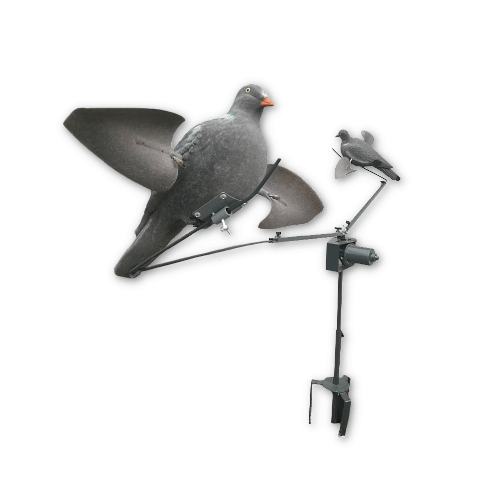 Der medfølger 2 fine lokkeduer med flock, som har vinger der drejer rundt i vinden og giver en naturlig lokkeeffekt på de trækkende duer.