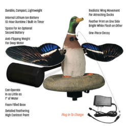 Denne Higdon Flydende Flasher, er løsningen hvis ænderne ignorere dine lokkefugle. Med sine realistiske fotoprintede vinger og den helt rigtige mængde flash, tiltrækker denne lokkefugl ænder ved at efterligne en gråand, som basker med vingerne. Dens flydende platform har en naturlig “mudderbrun” farve og går i et med vandets naturlige farve. XS Floating Flasher har et kompakt design med et mindre 12V lithium-ion batteri, hvilket reducerer vægt og størrelse. Den inkluderer en anti-vippe-enhed til blæsende forhold og er kompatibel med en fjernbetjening/modtager (sælges separat). Nyd en 10-timers køretid og hurtig 3-timers genopladningstid.