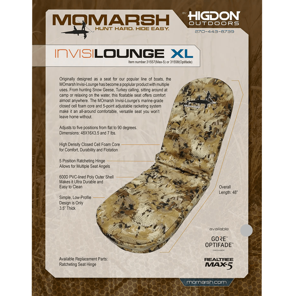 MOmarsh Invisi-Lounge blev oprindeligt designet som et sæde til brug i jagtpramme, men bruges nu til alt lige fra pramjagt og gåsejagt, til hygge rundt om lejrbålet. Stolens design og det specielle skumfyld med lukkede celler, gør den komfortabel og velegnet til brug, selv i vådt terræn.