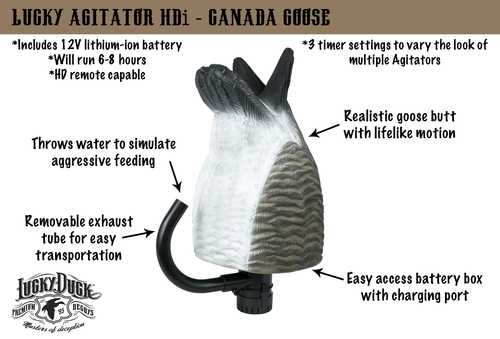 Lucky Duck Agitator HDI har en lille snorkel, der sprøjter vand op imod halen, så lokkegåsen bevæger sig kraftigt og skaber bevægelse som derved tilføjer realisme i din opstilling af lokkegæs.