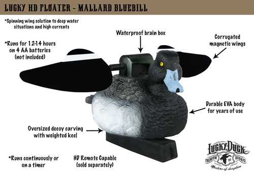 Lucky Duck Troldand Floater har vægtet køl, så den ligger stabilt i vandet og sorte magnetiske vinger med hvid aftegning, så den er ekstra synlig for de trækkende ænder.