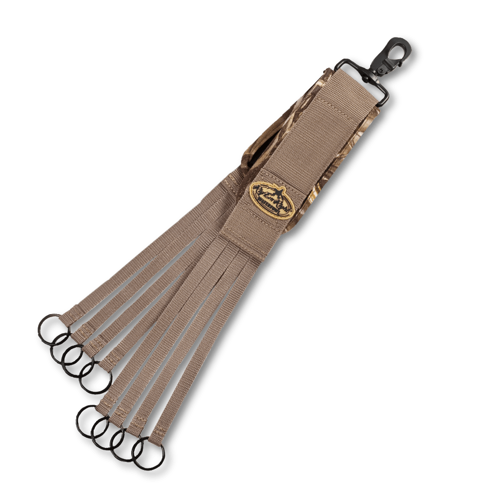 Bæreremmen har 8 stk. metalringe med kraftige stropper, der kan holde til transport af tungere fuglevildt f.eks. gæs.