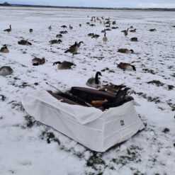 Det hvide cover på liggeskjulet er perfekt til gåsejagt hen på efteråret og vinteren, når svanerne raster og fouragerer på markerne.